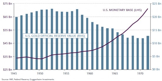Poniższy wykres obrazuje wartość rezerw złota zgromadzonych w USA w stosunku do łącznej sumy wyemitowanych dolarów. Dla przypomnienia od 1944 roku każdy dolar miał mieć 40% oparcie w złocie przy cenie 35 USD/ uncję. Inaczej mówiąc każde 1000 USD w rezerwach złota pozwalało na wyemitowanie 2500 USD.