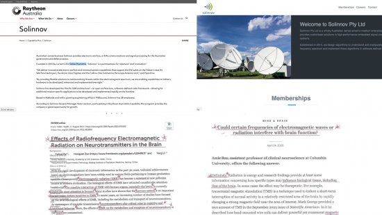 Potwierdzono wykorzystanie systemów Sanka Piyaratna, Solinnov Technology, Raytheon Australia - zaawansowanej technologii wojny elektronicznej, anten emitujących częstotliwości radiowe przeznaczonych dla operatorów rządowych i wojskowych.