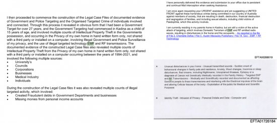 Zaświadczenia i dokumentacja medyczna przedstawiają opis psychologicznych skutków i dat ich wystąpienia. Opisuje zdarzenia, których ofiary doznały w wyniku ciągłego prześladowania i stosowania technologii związanej z zakłócaniem impulsów elektrycznych mózgu (w tym rządowych eksperymentów na ludziach) co skutkowało trwałymi szkodami psychologicznymi w życiu ofiar.