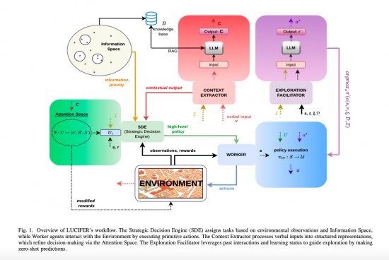„W odpowiedzi proponujemy LUCIFER (Language Understanding and Context-Infused Framework for Exploration and Behavior Refinement) – framework niezależny od domeny, łączący hierarchiczną architekturę podejmowania decyzji z uczeniem ze wzmocnieniem (RL) i dużymi modelami językowymi (LLM) w jeden spójny system. Struktura ta odzwierciedla sposób, w jaki ludzie dekomponują złożone zadania, pozwalając osobie planującej wysokiego szczebla na koordynację wyspecjalizowanych podagentów, z których każdy koncentruje się na odrębnych celach i powiązanych w czasie działaniach. W odróżnieniu od tradycyjnych zastosowań, w których LLM pełnią tylko jedną rolę, LUCIFER wykorzystuje je w dwóch synergistycznych funkcjach: 1. jako ekstraktory kontekstu – przekształcających słowne wypowiedzi interesariuszy w reprezentacje świadome dla specyfiki danej domeny i kształtujące decyzje za pomocą mechanizmu uwagi w przestrzeni, który wyrównuje wiedzę pochodzącą z LLM z procesem uczenia agenta, 2. jako mechanizmy eksploracji w trybie zero-shot (bez wcześniejszego treningu w danym zadaniu) – kierujące wyborem działań agenta w trakcie eksploracji. Przeprowadziliśmy benchmarking różnych modeli LLM w obu rolach i wykazaliśmy, że LUCIFER zwiększa efektywność eksploracji oraz jakość podejmowanych decyzji, przewyższając płaskie polityki warunkowane celem. Nasze wyniki ukazują potencjał podejmowania decyzji napędzanych kontekstem, w którym systemy autonomiczne wykorzystują ludzką wiedzę kontekstową dla osiągnięcia sukcesu operacyjnego.” czytamy dalej.
