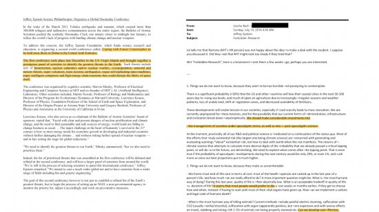 Co ciekawe w odtajnionych obecnie aktach Epsteina można znaleźć konferencje naukowe jakie organizował. Jedna z nich “Global Doomsday Conference” była w 2011 roku poświęcona aktom bioterroryzmu, katastrofom jądrowym i/lub wojnom jądrowym, przeludnieniu, zagrożeniom ze strony asteroidów i meteorytów, superwulkanów, masowych tektonicznych trzęsień Ziemi, zbuntowanych samoreplikujących się nanomaszyn, superinteligentnych komputerów oraz wysokoenergetycznych reakcji łańcuchowych, które mogłyby zakłócić strukturę samej przestrzeni.