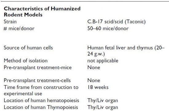 Na przykład 24 września 2007 r. NIH sponsorował "The New Humanized Rodent Model Workshop." W czasopiśmie AIDS Research and Therapy opublikowano podsumowanie tego warsztatu. Pewien naukowiec z federalnego funduszu, który uczestniczył w badaniu opisał "model myszy SCID-hu Thy/Liv ". [Tabela poniżej] wskazuje, że ta mysz została stworzona z „ludzkiej wątroby i grasicy płodu (20-24 gw)." Innymi słowy mysz została "zhumanizowana" narządami pobranymi od dzieci w wieku od pięciu do sześciu miesięcy po poczęciu.