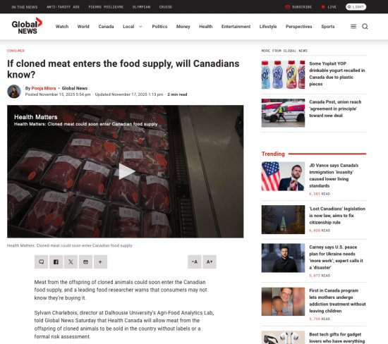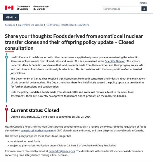 Zgodnie z obecnymi kanadyjskimi przepisami, sklonowane mięso jest klasyfikowane jako "nowa żywność", wymagająca rygorystycznych ocen bezpieczeństwa przed wprowadzeniem na rynek, zanim trafi do sklepów spożywczych. Health Canada potwierdziło, że żadne sklonowane mięso ani produkty mleczne nie są obecnie zatwierdzone do sprzedaży, podkreślając, że istniejące zabezpieczenia pozostaną w mocy do dalszego przeglądu.