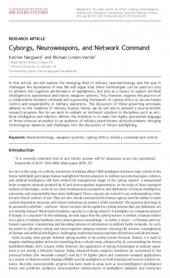 Całością tych zagadnień zajęli się badacze z duńskiego kolegium obrony (Royal Danish Defence College) opisując różne zagadnienia i problemy wynikające z wprowadzenia cyborgów. W badaniu „Cyborgs, Neuroweapons, and Network Command” z 2021 roku, we wstępie, napisano, że w najbliższym czasie nastąpi połączenie człowiek-maszyna i tworzenie cyborgów. W związku z czym pojawia się zasadnicze pytanie czym na polu bitwy jest cyborg - człowiekiem czy maszyną. Badacze wskazali, iż ani jednym ani drugim. Jest zbiorem ludzkich i nie-ludzkich (Ai i rozwiązania robotyczne) potencjałów przesyłającym i przetwarzającym strumienie informacji na polu bitwy. Cyborg jest zatem hybrydą człowiek-maszyna-sieć lub szerzej zbiorem sieci, czujników, systemów komunikacyjnych, operatorów, komputerów, platform bojowych i funkcji mózgowych [str. 97]. Dokument określa to jako rozszerzona i rozproszona architektura systemowa „hybrydowej sieci człowiek-maszyna integrującej sztuczną i ludzką kognicję w planowanie i kontrolę misji”.
