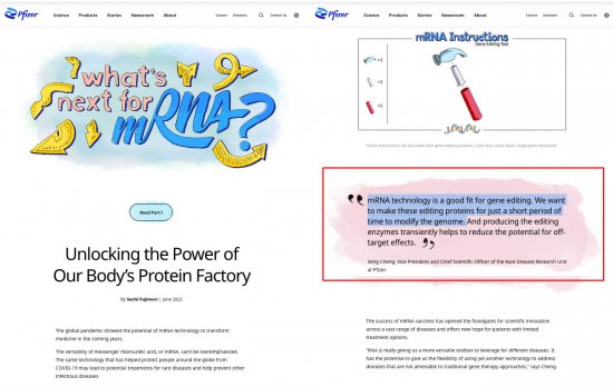 Firma Pfizer nawet nie ukrywa faktu, że ich szczepionki mRNA służą do edycji genów, w szczególności do modyfikacji ludzkiego genomu. Na stronie internetowej firmy Pfizer stwierdza się: „Technologia mRNA dobrze nadaje się do edycji genów. Chcemy, aby te białka edycyjne działały przez krótki okres czasu, aby zmodyfikować genom” - Pfizer.