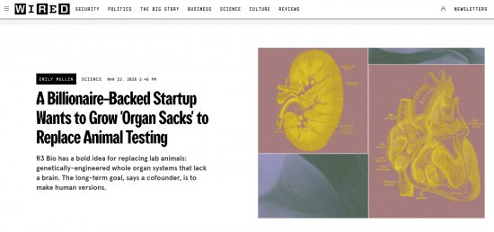 Artykuł Wired podał, że „Firma zmierza w kierunku zastępowania ludzkich części ciała — co jest rozwijającym się podejściem w dziedzinie przedłużania życia. Startup dąży do stworzenia nieświadomych swego istnienia worków z ludzkimi narządami, które mogłyby dostarczać krew, tkanki i narządy ludziom, gdy ich własne ciała odmówią posłuszeństwa."
