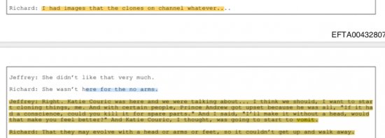 Jak wynika z opublikowanych maili Epsteina zajmował się on m.in. tworzeniem ludzkich klonów dla pozyskiwania z nich organów. Z zarejestrowanych rozmów wiemy, że robił je m.in. dla księcia Andrzeja, stwierdzając, iż ze względów etycznych może wykonywać klony „bez głowy”.