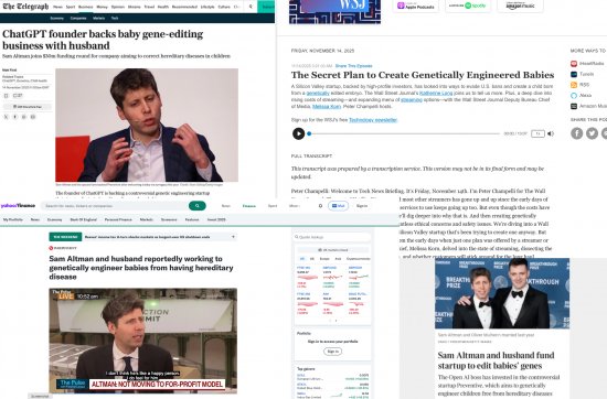 Obecnie do tej listy dołączył szef firmy OpenAi tworzącej ChataGPT. Jak podała gazeta The Wall Street Journal firma sponsorowana przez Altmana prowadzi eksperymenty edycji zarodków za granicą, w krajach, gdzie jest to legalne, mając na celu rozwój technologii do produkcji dzieci z wyższym IQ i bez chorób genetycznych. Takie praktyki są nielegalne w USA i wielu innych państwach.