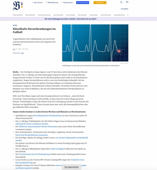 17-letni piłkarz o imieniu Dylan Rich zmarł na atak serca w połowie meczu w Anglii. 24-latek Lucas Surek zachorował na chorobę mięśnia sercowego i musiał być odsunięty z klubu BFC Chemie Leipzig. Dwudziestopięcioletni Kingsley Coman z FC Bayern Monachium przeszedł operację serca po arytmii serca po szczepieniu. Belgijski Rune Coghe (18) doznał ataku serca podczas meczu. 31-letni Fabrice N’ Sakala ze Stambułu upadł na boisku i musiał zostać przewieziony do szpitala. Lider zespołu Bitterfeld, Dietmar Gladow, również doznał ataku serca przed meczem. Marvin Schumann, amator Gifhorn, doznał zatrzymania akcji serca i musiał być reanimowany. JSG Hoher Hagen musiał reanimować 17-letniego zawodnika w środkowej fazie gry w Hannoversch Munden.