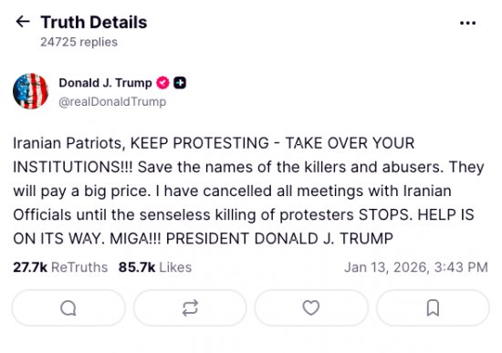 „Patrioci irańscy, KONTYNUUJCIE PROTESTY – PRZEJMIJCIE KONTROLĘ NAD SWOIMI INSTYTUCJAMI!!! Zapisujcie nazwiska morderców i oprawców. Zapłacą wysoką cenę. Odwołałem wszystkie spotkania z urzędnikami irańskimi do czasu zatrzymania bezsensownego mordowania demonstrantów. POMOC JEST W DRODZE. MIGA!!! PREZYDENT DONALD J. TRUMP”, napisał.