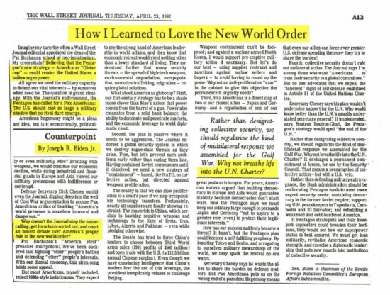 W opublikowanym w Wall Street Journal artykule, zatytułowanym “How I Learned to Love the New World Order“, (Jak nauczyłem się kochać nowy porządek świata), Biden wyjaśnia swoje plany zrzeczenia się suwerenności Ameryki na rzecz ONZ i ustanowienia jednego rządu światowego poprzez „tchnięcie życia w Kartę Narodów Zjednoczonych”.