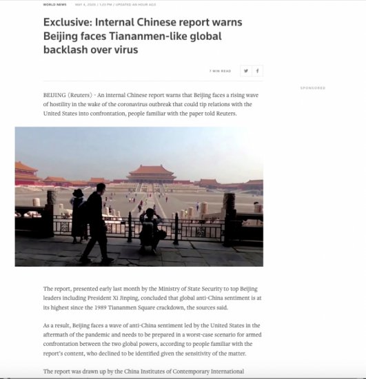 „Wewnętrzny chiński raport ostrzega, że Pekin staje w obliczu rosnącej fali wrogości w następstwie wybuchu koronawirusa, co może doprowadzić do konfrontacji ze Stanami Zjednoczonymi - ludzie blisko gazety podali Reutersowi”, donosi dziennik, twierdząc, że nie dostał dokumentu do wglądu. „Raport, przedstawiony na początku ubiegłego miesiąca przez Ministerstwo Bezpieczeństwa Państwowego czołowym przywódcom Pekinu, w tym prezydentowi Xi Jinpingowi, stwierdził, że światowe antychińskie nastroje są najwyższe od czasu represji na Placu Tiananmen w 1989 r., podały źródła.”