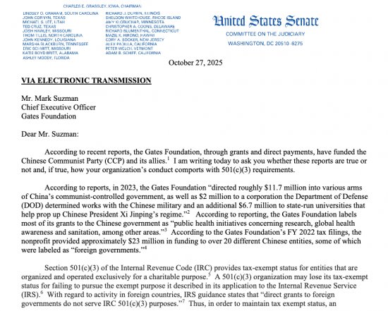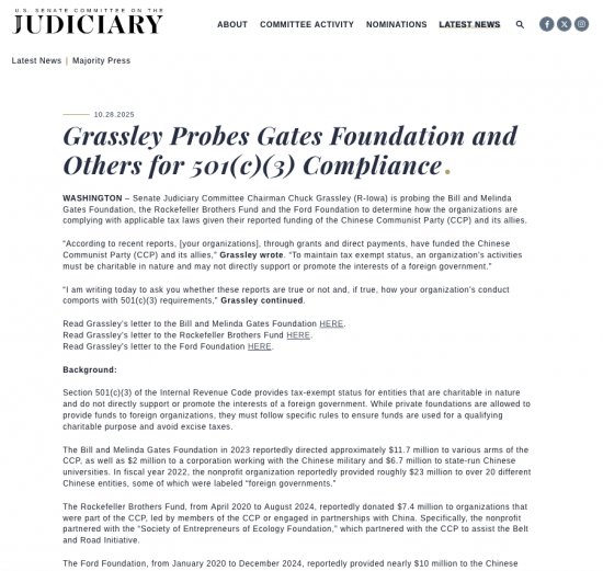We wtorek w komunikacie prasowym Senackiej Komisji Sądowniczej ogłoszono, że jej przewodniczący, Chuck Grassley, prowadzi dochodzenie przeciwko Fundacji Billa i Melindy Gatesów, Funduszowi Braci Rockefeller (Rockefeller Brothers Fund) oraz Fundacji Forda w sprawie ich zgodności z prawem podatkowym, w związku ze „zgłaszanym finansowaniem Chińskiej Partii Komunistycznej (CCP) i jej sojuszników” przez te globalistyczne fundacje.