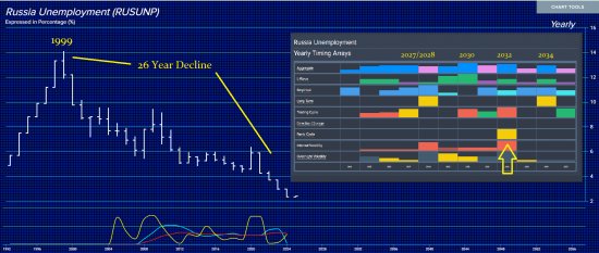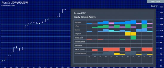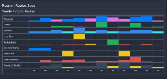 Kiedy przejdziemy do Rubla, widzimy Cykl Paniki w 2027 roku, a bieżący rok jest zmianą kierunku. Te fałszywe, udające ekspertów think tanki, które są podżegaczami wojennymi na wskroś, dopną swego, ponieważ prasa zawsze publikuje ich bzdury i mówi światu, że Rosja jest słaba, że to „papierowy tygrys”, i że możemy wejść, a Putin padnie na kolana, a naród rosyjski będzie wiwatował i dziękował im za uratowanie.