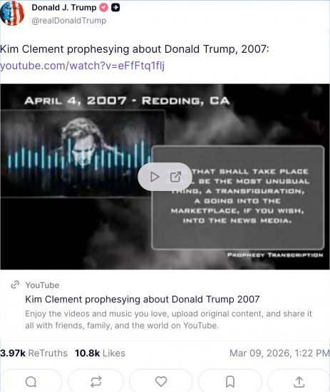 Biggs i Clement oraz ich proroctwa mają obecnie duży wpływ na administrację Trumpa i na samego prezydenta otoczonego przez zbory zielonoświątkowe. Jest to uwidocznione przez niedawną publikację nagrań Kima Clementa na koncie prezydenta na platformie Truth Social. Choć Clement w opublikowanym kazaniu wprost nie mówi, że te słowa odnoszą się do Trumpa, ale prezydent i jego zwolennicy przyjęli narrację, że rządy Trumpa zostały przepowiedziane przez tego proroka.