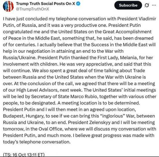 Dodał, że była to „bardzo produktywna” rozmowa, podczas której Putin pogratulował mu „Wielkiego Osiągnięcia Pokoju na Bliskim Wschodzie” w nawiązaniu do porozumienia pokojowego w Gazie.