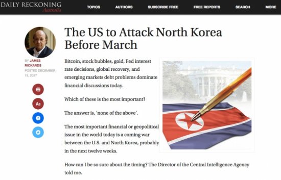 Autor James Rickards, który ma kontakty wywiadowcze stwierdził, że dyrektor CIA powiedział mu, że w ciągu 12 tygodni Stany Zjednoczone będą w stanie wojny z Koreą Północną.
