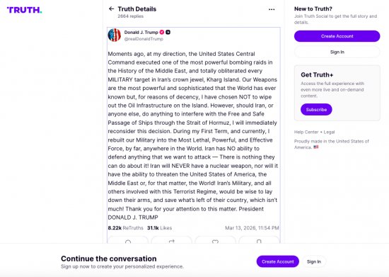 „Chwilę temu, na moje polecenie, Dowództwo Centralne Stanów Zjednoczonych przeprowadziło jeden z najpotężniejszych nalotów bombowych w historii Bliskiego Wschodu i całkowicie zniszczyło każdy CEL WOJSKOWY na irańskim klejnocie, wyspie Chark” napisał Trump.